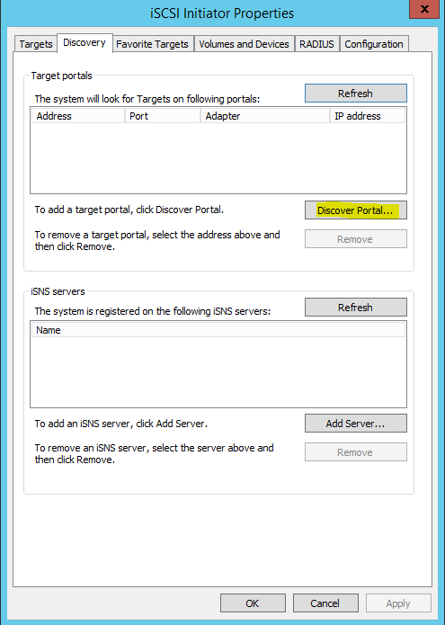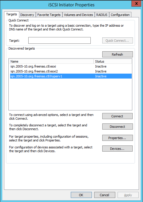 You can launch the iSCSI initiator setup on the Hyper-V boxes by running the iscsicpl.exe command.