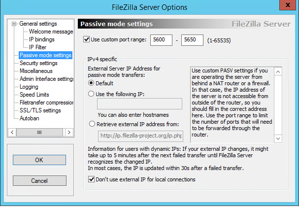 Set the Passive mode settings to use custom port range and set a range of ports of your choosing…in my case from 5600 to 5650.