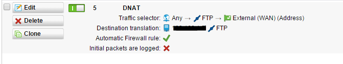 On the Sophos side, we can simply add a DNAT rule to pass traffic destined for the outside WAN address for the FTP service to change the destination to our internal server IP address. You would setup your rule similar to the following: