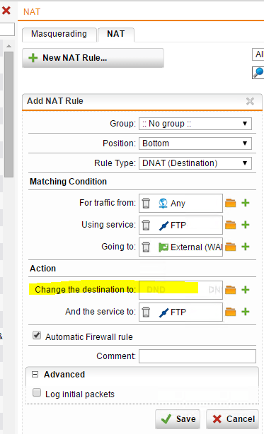 We then need to Change the destination to and here you will enter the IP address or network definition host that you have already built in this field. Keep the service as FTP. Be sure to select the Automatic Firewall rule as this will take care of the corresponding firewall rule to allow FTP traffic to and from your host.