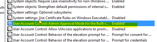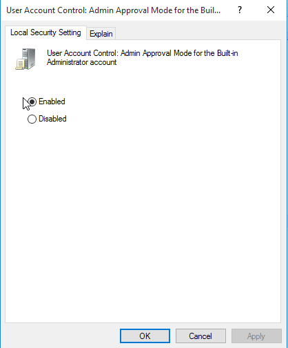- Underย Local Policies/Security Options navigate to “User Account Control Admin Approval Mode for the Built-in Administrator account“