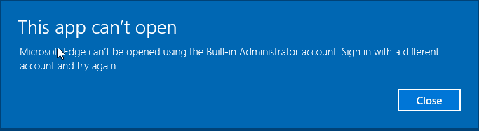 With the release of Windows 10 today, many are spinning up VMs and loading the new workstation on test boxes to take a look at the final build version. ย If you are like me, one of the first things I wanted to test drive was the final release build of the Edge browswer. ย Quickly however, I ran into an issue (security feature) out of the box with the built-in administrator account attempting to launch Edge. ย I received the errorย Microsoft Edge can’t be opened using the Built-in Administrator account. ย Sign in with a different account and try again.