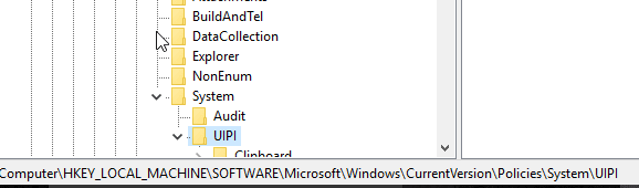 - HKEY_LOCAL_MACHINESOFTWAREMicrosoftWindowsCurrentVersionPoliciesSystemUIPI