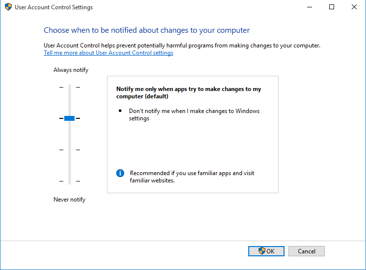 Also, in addition to the above, make sure your User Account Control Setting is set to the third level from the bottom. To get to UAC, go to your Windows 10 search and type uac. It should come up as โChange User Account Control Settingsโ(It is given in this page but still…)
