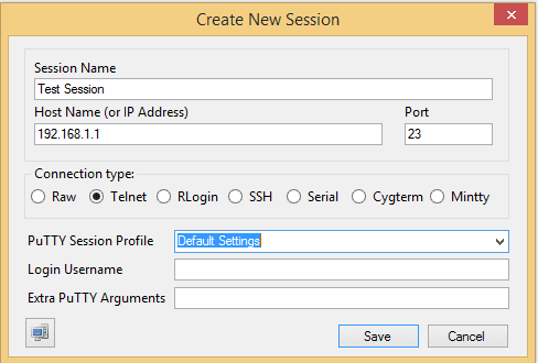You should then see the “Create New Session” dialog box. ย Here you can name the session and then also fill in the connection information. ย Notice however, the “Putty Session Profile” dropdown. ย We will leave it as “Default Settings” for now.
