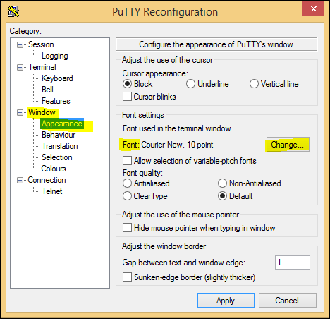Now we can get started configuring the look of our current terminal session as well as future connections. ย Below underย Window >> Appearanceย section we can change the font and size.