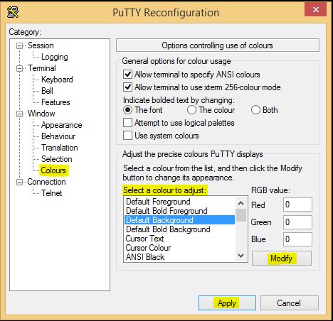 Also found under theย Window section of the Putty configuration is Colours which allows the modification of the background color and foreground color. ย This is a little nonintuitive as the foreground actually encompasses the text color. ย So that is the attribute you modify to change your text color.
