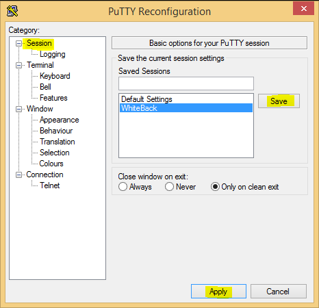 The key here to making this work for us is before you close out of the configuration, save theย Session as a Session name. ย So for me I created a white background session profile below, so you see the “WhiteBack” listed.