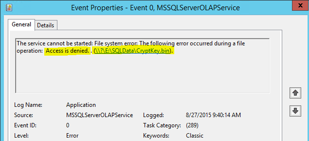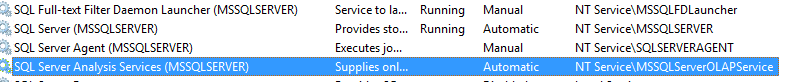 I took a look at the service and of course it was in a stopped state. ย The user account that is used for the service to start and perform its functions by default is theย NT ServiceMSSQLServerOLAPService account.