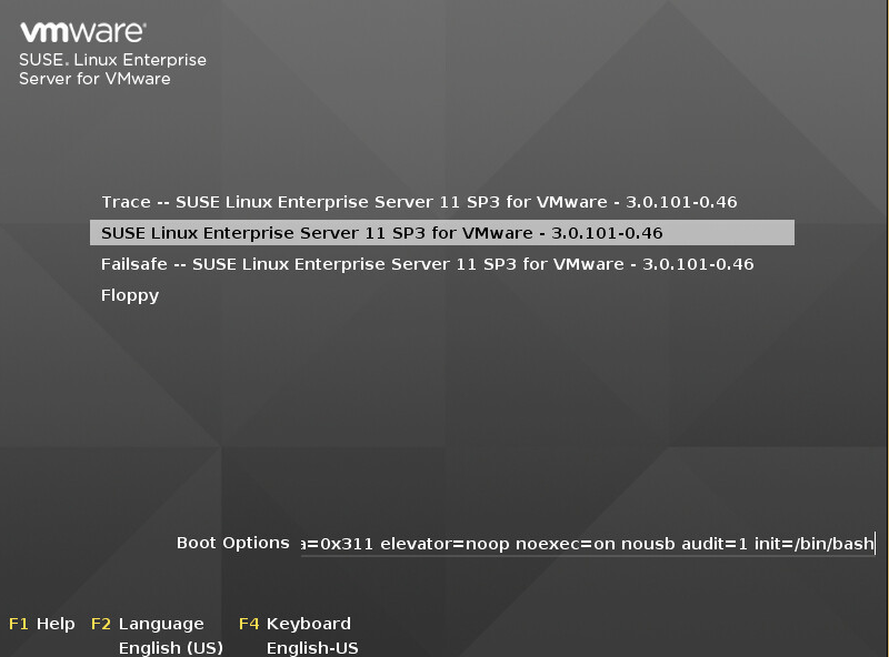 Just a quick interlude here, if you have a locked out root account, you will need to reboot your vRealize VM and enter the following boot option into your SUSE boot loader at the end of the line: