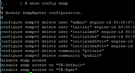 Adding the users back: configure snmpv3 add user "admin" engine-id <your engine-id goes here> configure snmpv3 add user "initial" engine-id <your engine-id goes here> configure snmpv3 add user "initialmd5" engine-id <your engine-id goes here> configure snmpv3 add user "initialsha" engine-id <your engine-id goes here> configure snmpv3 add user "initialmd5Priv" engine-id <your engine-id goes here> configure snmpv3 add user "initialshaPriv" engine-id <your engine-id goes here> Enabling the communities: configure snmp add community readonly public configure snmp add community readwrite private Enabling SNMP access: enable snmp access vr "VR-Default" enable snmp access vr "VR-Mgmt" enable snmp access Setting up the snmpuser: configure snmpv3 add user yoursnmpuser authentication md5 privacy Adding your SNMP user to the appropriate group: conf snmpv3 add group admin user yoursnmpuser sec-model usm
