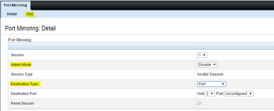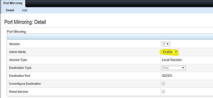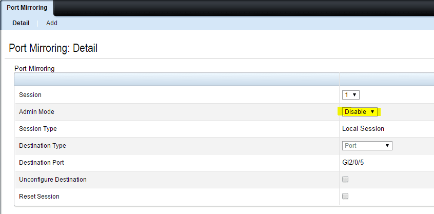 Notice below that theย Admin Modeย is set toย Disable. ย This means that the port mirroring functionality is not turned on. ย And obviously we don’t have a destination setup or source port(s) defined.