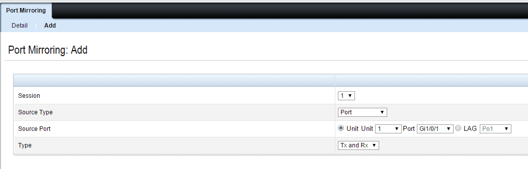 To add a source port for the port mirror, simply click the Add button at the top of the Port Mirroring window and you will see theย Port Mirroring: Add box to select your source port.