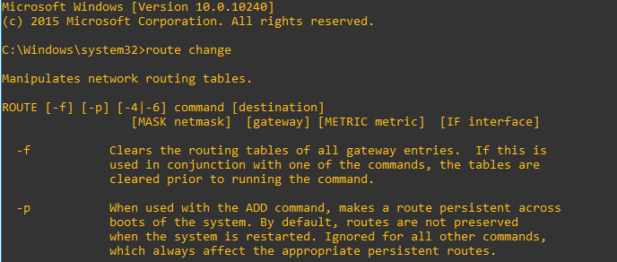 To change a static route to persistent we use the route changeย command show below. ย Note the addition of theย -p on the end.