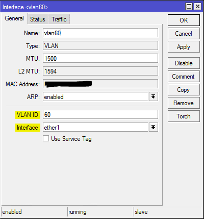 Navigate to Interfaces in Winbox and create a new VLAN interface. In the example below, we have created a new VLAN 60 interface bound to Ether1 interface on the Mikrotik RB951G as this is the “WAN” port or trunk port that will connect to the upstream switch.
