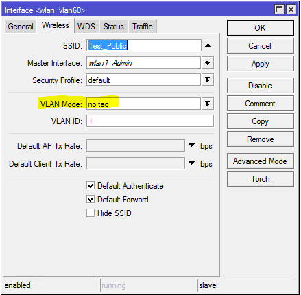 On the virtual AP side, we have the standard AP or wlan1 by default and then we will configure one virtual AP for the public side. Notice below that we have the VLAN mode left set at no tag. The private side wlan1_Admin VLAN config looks the same with no tag set as the VLAN mode option.