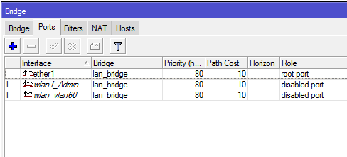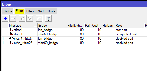 Now we can bridge ether1, wlan1_Admin, and wlan_vlan60 together in the ports tab