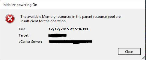 Recently, I ran into an odd issue with a VM that was configured in a three node VMware vSphere 6 cluster. ย The cluster housed about 30 other VMs that were functioning properly and had no issues. ย After powering off one VM in particular for some disk maintenance and attempting to power back on, the error popped up in vCenter: ย the available memory resources in the parent resource pool are insufficient for the operation. ย In this particular environment, we are using the VCSA 6 appliance.