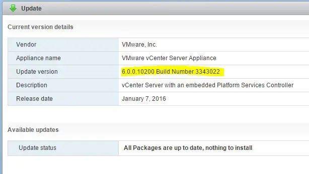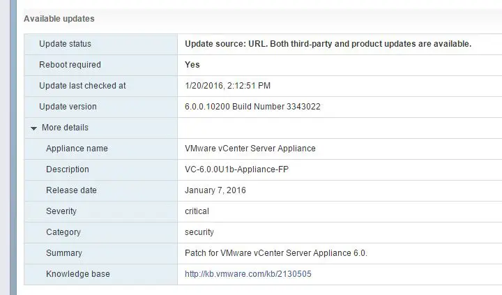 As you can see below, when I ran the update check, it came back with the available update to take the appliance toย VC-6.0.0U1b level, build numberย 3343022
