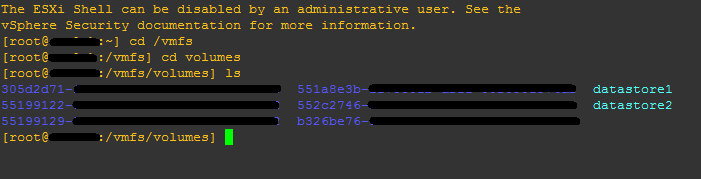 In the command above we are reclaiming free space of the volume “11111111-2222222e-1b24-c12345678abcd”. The volume UUID is easy to get – SSH into your host and navigate to your /vmfs/volumes and list the volumes from there. You will see the “datastore” name in front of the UUID the system understands. In putty you can simply drag over this and it will be copied which makes for an easy past into the esxcli storage command listed above.