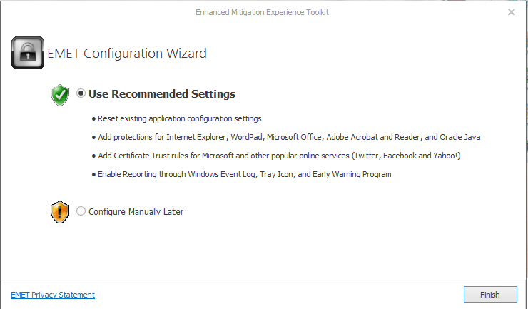 During the install, you will be prompted with the EMET Configuration Wizard, which presents the two options toย Use Recommended Settingsย orย Configure Manually later.