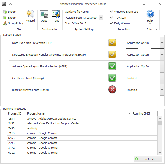 Below are a few of the options you see when launching EMET 5.5. ย Below are a few of the configurable parameters – Data Execution Prevention (DEP), Structured Exception Handler Overwrite Protection (SEHOP), Address Layout Randomization (ASLR), Certificate Trust (Pinning), Block Untrusted Fonts (Fonts).