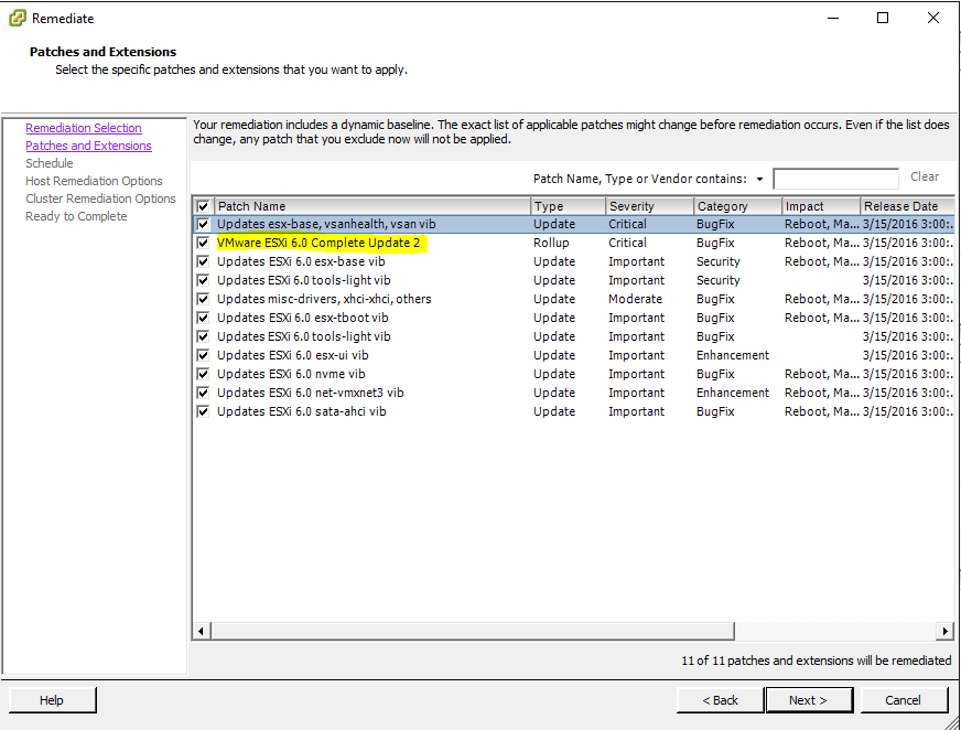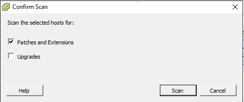 After clicking the Scan action, you will see the pop up box asking for types of updates/upgrades you are looking for. ย I you are already on ESXi 6.0 you can simply selectย patches and extensionsย since it is a rollup patch.