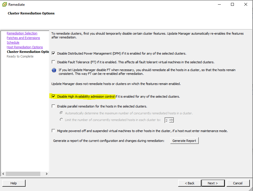 Be sure to disable theย High Availability admission control setting by selecting the box.