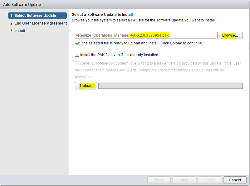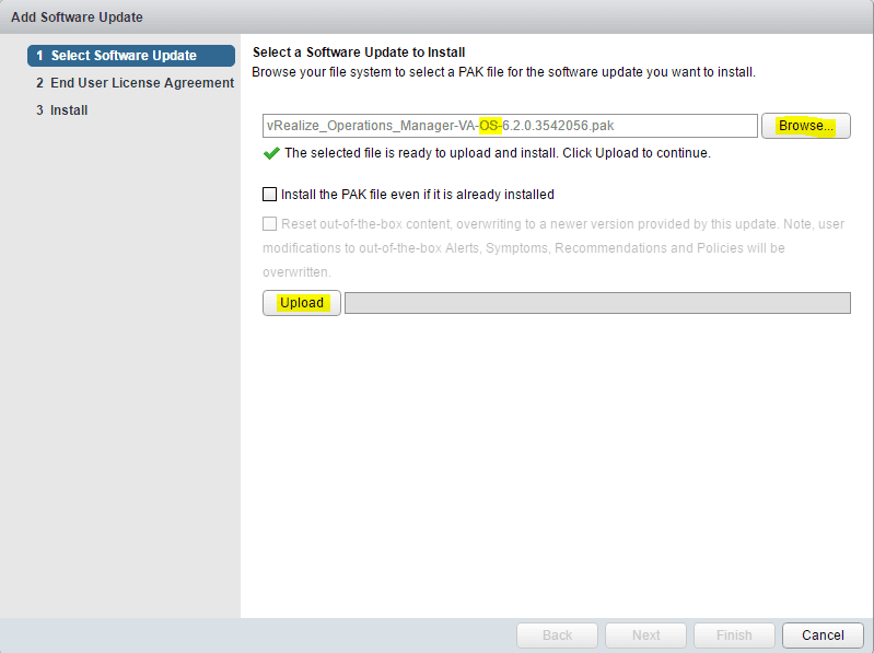 First thing you will need to do is pull down the .pak file from VMware. ย As you can see below I have downloaded the vRealize_Operations_Manager-VA-OS-6.2.03542056.pak file. ย Notice the file is for the OS. ย The updater will ask you to browse to the file and then you will have the ability to Upload.