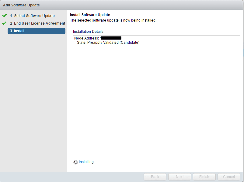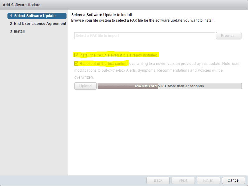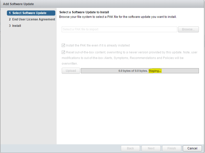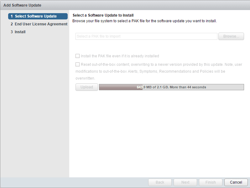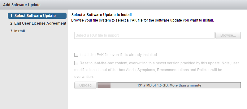 Basically it is a refresh issue if the UI times out on the other install. ย The workaround as noted on VMware’s site is: ย “Workaround: When you perform the software update again, check the option to Install the PAK file even if it is already installed, then click Upload.”