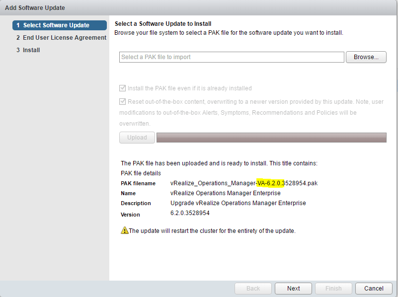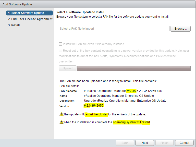 After updating the OS files, below we now can run the update .pak file for the vROPs application upgrade.