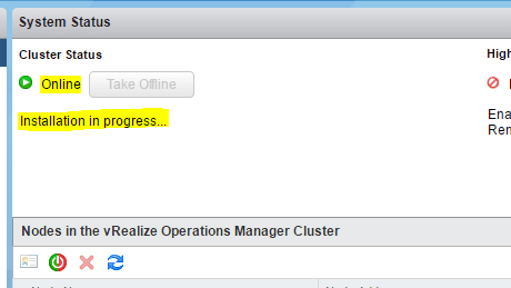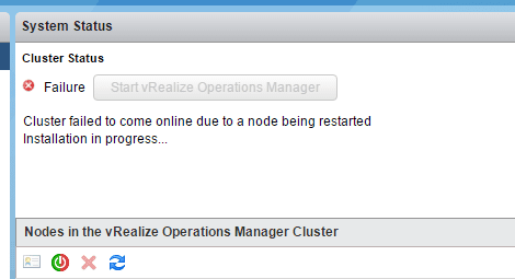 After logging back in you may see a Cluster Status of “Failure” showing – but if you look carefully it will let you know the node is being restarted and installation is in progress.