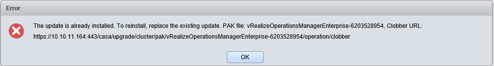 I ran into this issue below which I did find the issue of “the update is already installed” documented on VMware’s KB for upgrading vROPs. Check this KB out: ย https://pubs.vmware.com