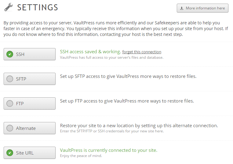 After gettingย the user to connect Vaultpress AWS EC2 instance, the plugin and service is pretty hands off. ย The Lite version which is the cheapest solution is $5 a month and is quite a bit of security for that price – daily backups, offsite backups, 30 day history of backups, etc. ย Hopefully, the above post will help any who run WordPress on EC2 to be able to connect Vaultpress up with AWS.