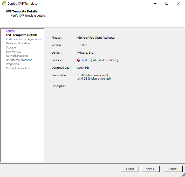 The next thing you need to do is deploy your HTML5 appliance fling OVA. I am not going to detail every screenshot of the deployment as it is pretty standard with deploying any other OVA appliance. However, just to note you will see the publisher as “Test” so don’t let that alarm you.