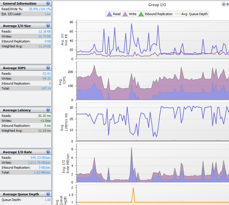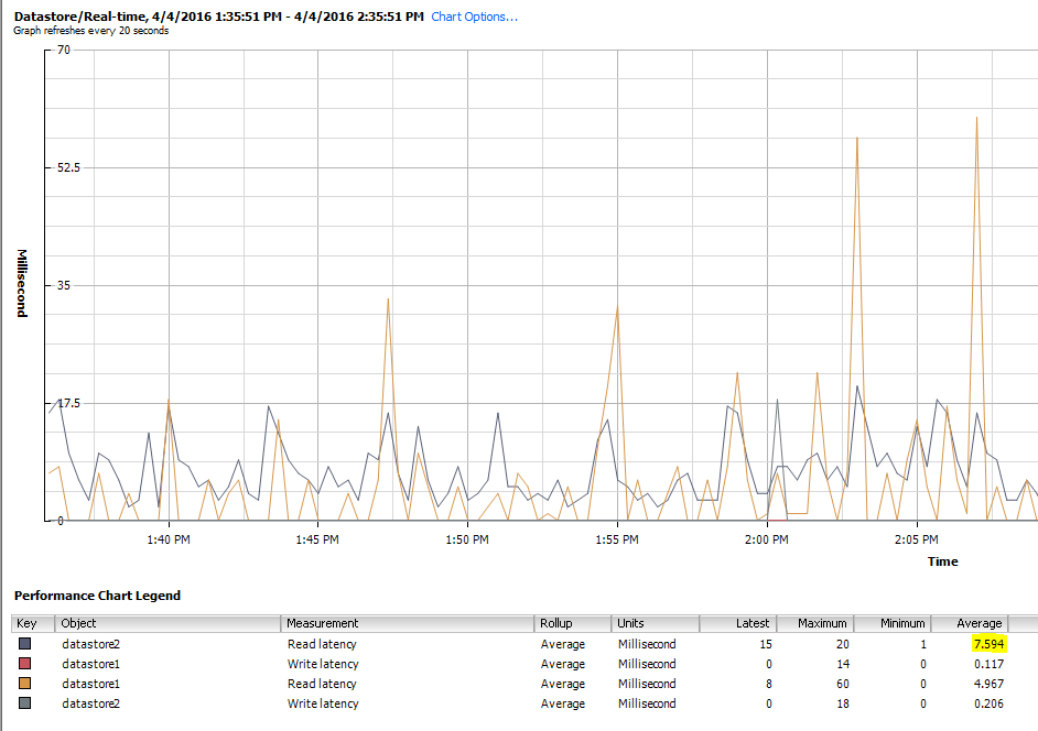 The above shows a fairly healthy box with some peaks. We like latency to be around 5 milliseconds and never sustained above 20 milliseconds. This can give you an idea of your storage performance from within the vSphere client itself.