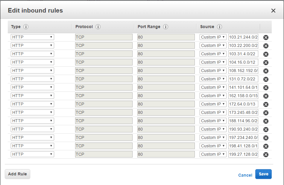 This brings up theย Edit inbound rulesย table. ย Here you can click theย Add Rule button at the bottom which makes a new row in the table for your configuration. ย Make sure you specifyย HTTP for theย Type andย Custom IPย for theย Source. ย Then you simply add the Cloudflare IP addresses. ย You can then remove theย Any Source andย 0.0.0.0/0ย which will restrict any web traffic except that coming from Cloudflare.