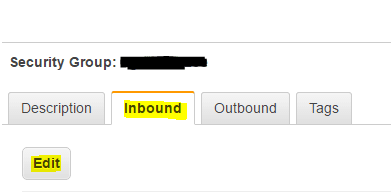 To edit, all you do is click on the security group. ย Then the table at the bottom will have (4) tabs – Description, Inbound, Outbound, Tags. ย We are concerned with restrictedย Inbound traffic, so click theย Inbound tab and thenย Edit.