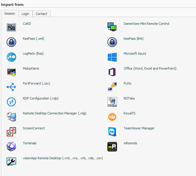 The other really nice thing that I know you are probably thinking is – how do I get all those other remembered connections in my other utility over to RDM free? ย Well, there are a number of selections that you can do to Import that allow you to point to RDCM files, and other for remote desktop. ย You can point to Putty connections, MobaXterm, and others. ย A bummer for me or at least in the while since I have been playing around with it, I was not able to get it to successfully import my generated XML file from SuperPutty. ย It acts like it was going to import, but simply doesn’t do anything. However, the features of this app were good enough that I was willing to recreate my entries.