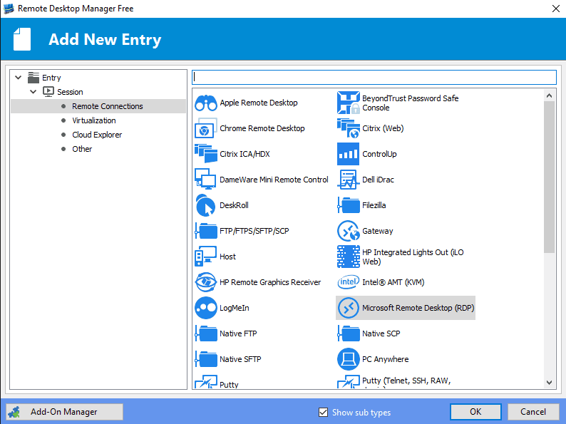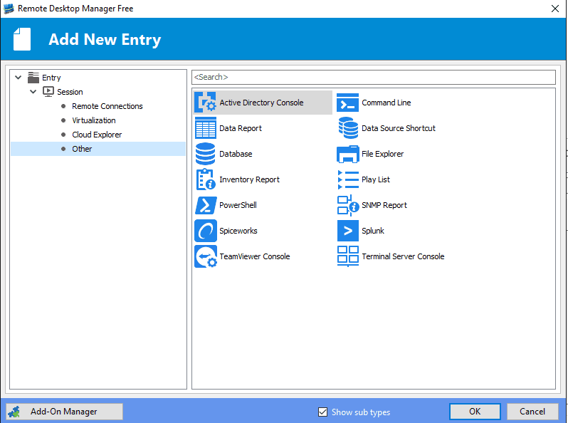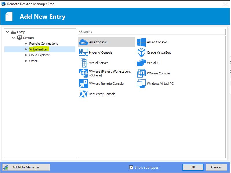 As you can see below, I just clipped the “Add New Entry” screen and the connection varieties here are just staggering – Remote Connections, Virtualization, Cloud Explorer, and other. ย There is even anย Add-On Manager which has a ton of additional add-ons that can be installed. ย You could literally replace everything you use with this console.