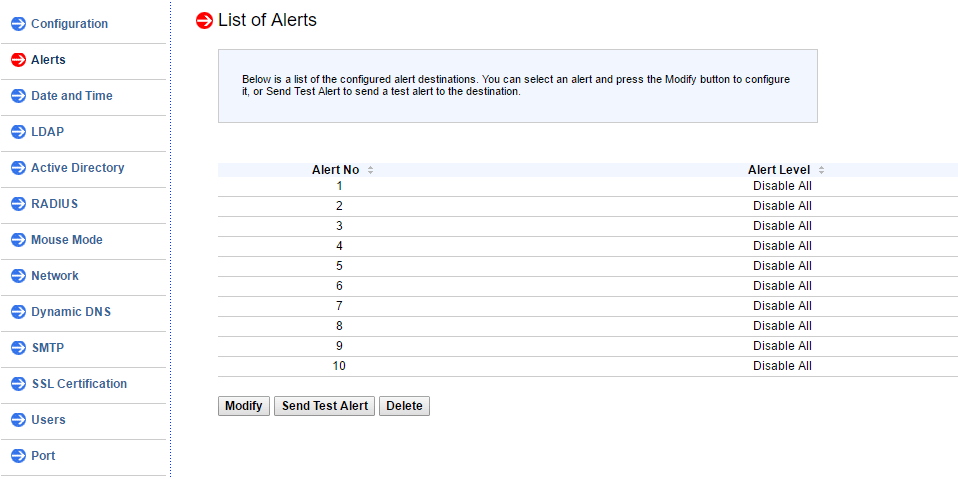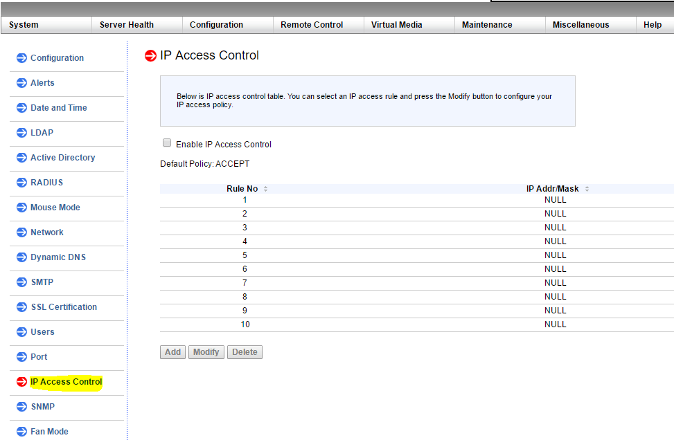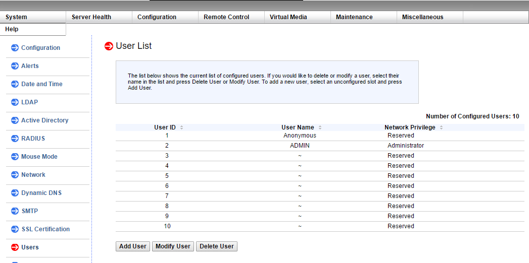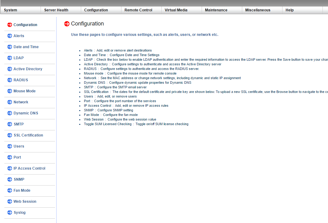 With the configuration section, you can perform a whole array of tasks here including Alerts, RADIUS auth, network config (for IPMI itself), SMTP configuration for alerts, IP Access Control, Syslogs, etc.