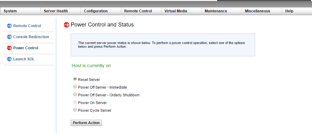 Under the remote control section, the power control menu allows you to Reset, Power Off Immediate, Power Off gracefully, Power On, or Power cycle, all which are very handy if you are remotely trying to troubleshoot or power a server off or back on.