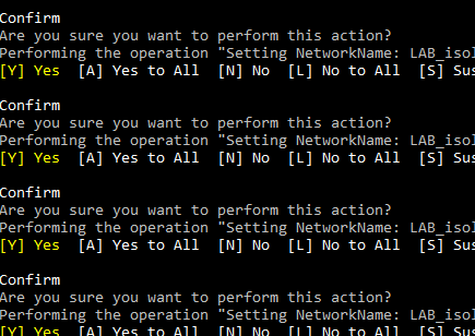 As you can see above, it reads the VMs in the folder location, gets the current network adapter properties – in particular the networkname and then sets that networkname to the network that we want it to be. I placed a -confirm:$true on the end just to make sure things were setting as expected.