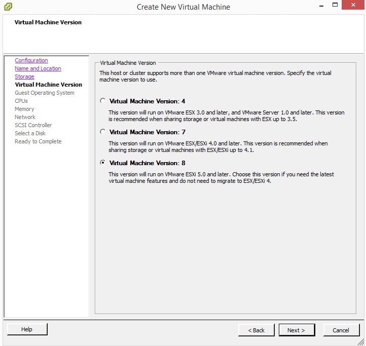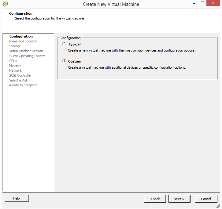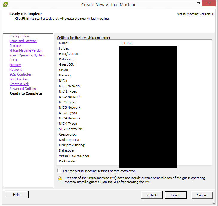 Our first step with getting the EXOS install going is creating our shell virtual machine. ย Start out with aย Customย option here.