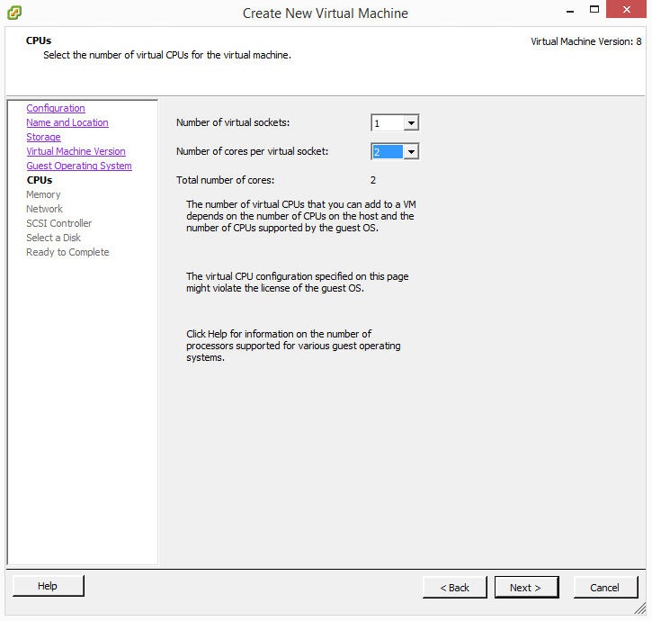 Choose (1) virtual socket and (2) cores per virtual socket.
