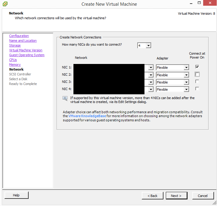 The network setup is a little bit different. ย We need to choose (4) NICs to connect. ย However, only check one of the NICs toย Connect at Power On. ย I connected the (4) NICs to the same network for now (more on this later). ย The reason you want to disconnect the other three is that this avoids potential switching loops. ย The way the VM is designed is that the first port is the out-of-band management port, then the other VM network adapters are “front panel” ports. ย We use these to connect to unique internal virtual switches.