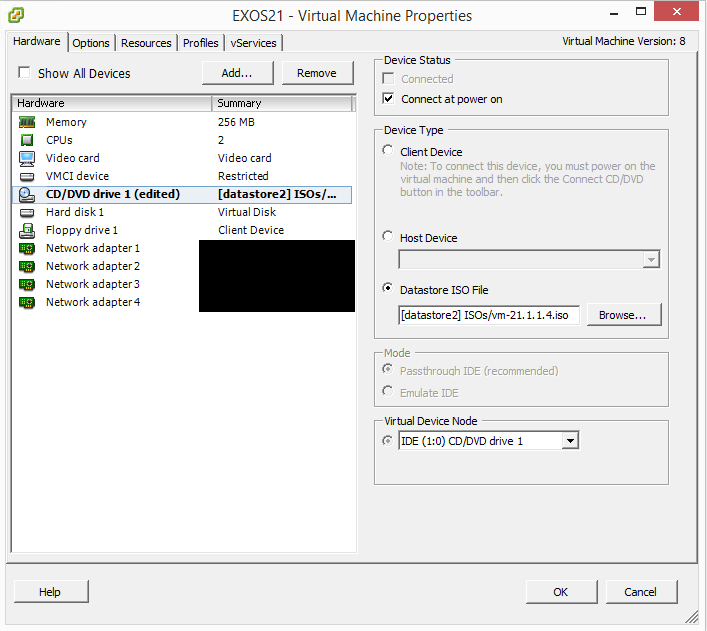 Go into the properties of the virtual machine and edit your CD drive to choose the EXOS version 21 ISO you downloaded with the link provided above.