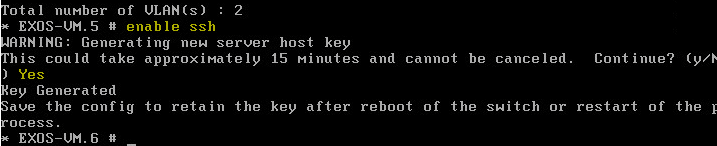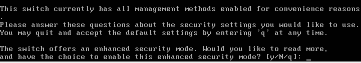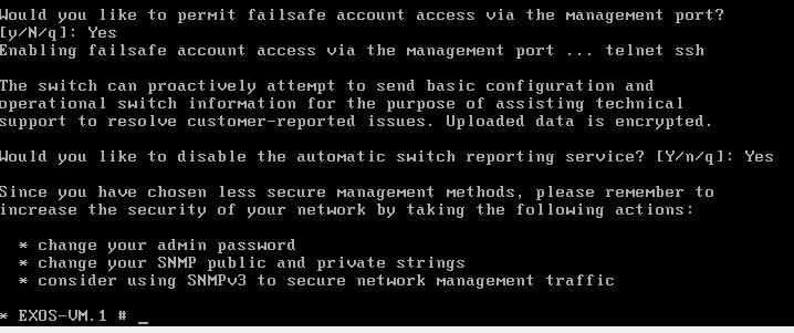 As with a real EXOS switch on first boot, you are prompted to enableย enhanced security mode and other prompts that you will see below about enabling/disabling services (telnet, failsafe account, switch reporting, management access, etc).