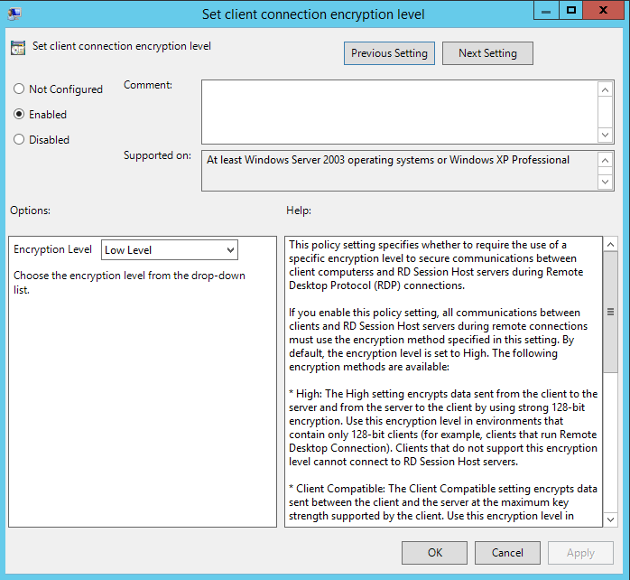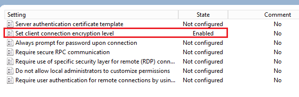 To find the setting below run the commandย gpedit.msc from a run/search menu. ย Navigate toย Computer Configuration >> Administrative Templates >> Windows Components >> Remote Desktop Services >> Remote Session Environment >> Security. ย The settings we are looking for is theย Set client connection encryption level.