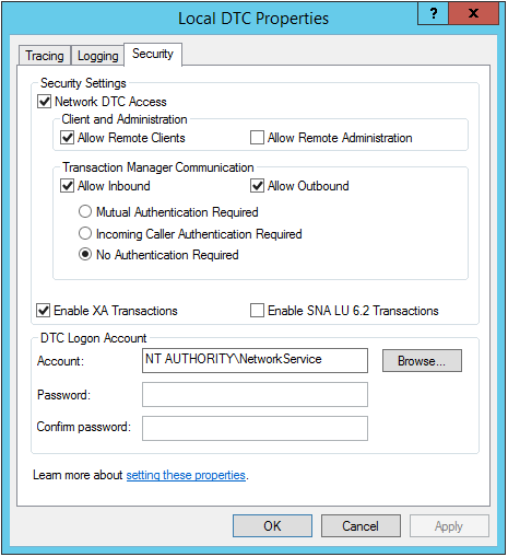 - Also, sets the security account on the DTC Logon Account properties.